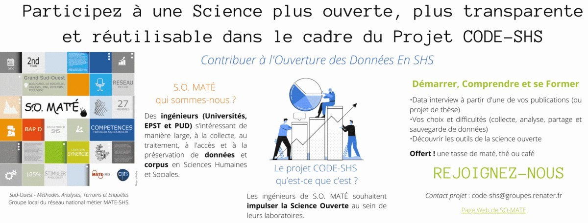 Retrouvez l’ensemble des informations et des actualités du projet CODE-SHS Contribuer à l’ouverture des Données en SHS porté par SO-MATé sur :